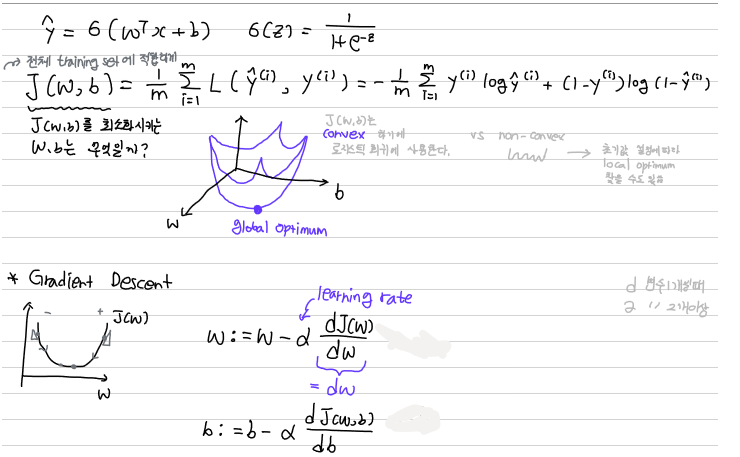 Cost Function์ด ์ต์ํ๋๋ w์ b๋ฅผ ์ฐพ๋ ๊ฒ(=Global Optimization์ ๊ฐ๊น์ด w,b)์ด ๋ชฉํ์ด๋ค.