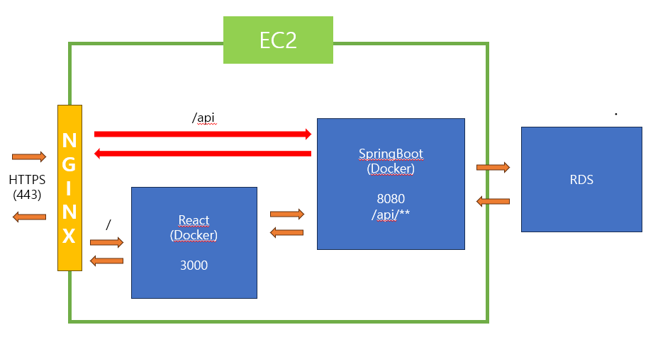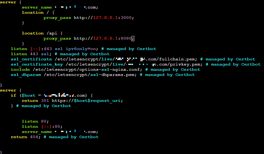 NGINX ์์ /api ๋ก ์์ฒญ์ด ๋ค์ด์ค๋ฉด 8080 ํฌํธ๋ก, /๋ก ์์ฒญ์ด ๋ค์ด์ค๋ฉด 3000ํฌํธ๋ก ์์ฒญ์ด ๊ฐ๋๋ก ํ๋ ค๊ณ ํ๋ค.