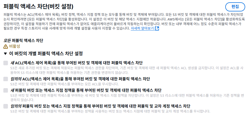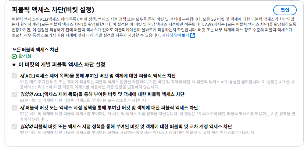 2. ํผ๋ธ๋ฆญ ์ก์ธ์ค ์ฐจ๋จ์ ํผ ์ฑ S3 ๋ฒํท์ ์์ฑํ๋ค